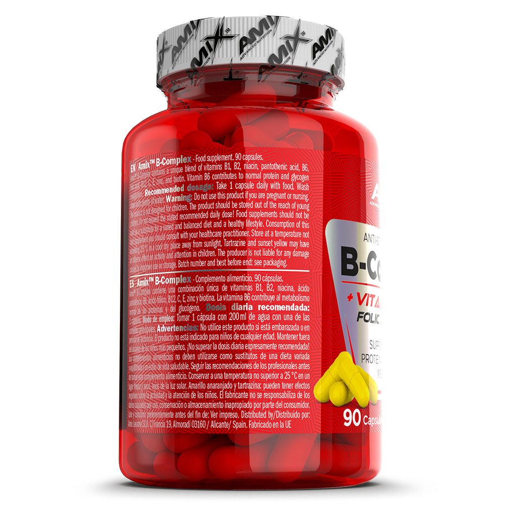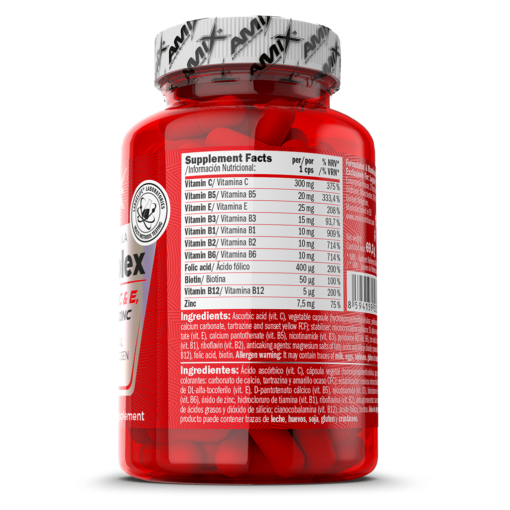 Amix™ B-Complex contains a unique blend of vitamins B1, B2, B3, B5, B6, B9 (Folic Acid), B12, Vitamins C & E, Zinc and Biotin.
